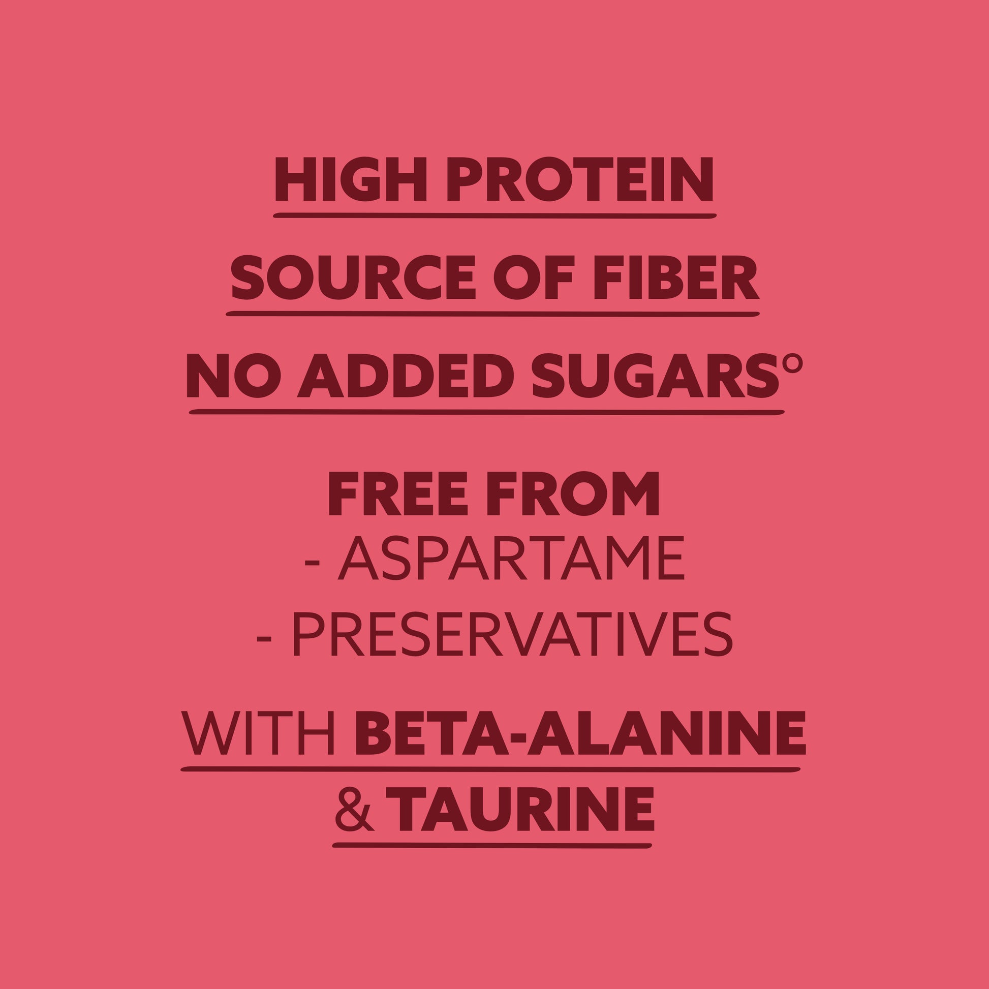 High-quality protein sources & BCAAs. High fiber, no added sugars°, free from aspartame & preservatives, high in niacin & vitamin B6, source of magnesium, and featuring caffeine, beta-Alanine & taurine.