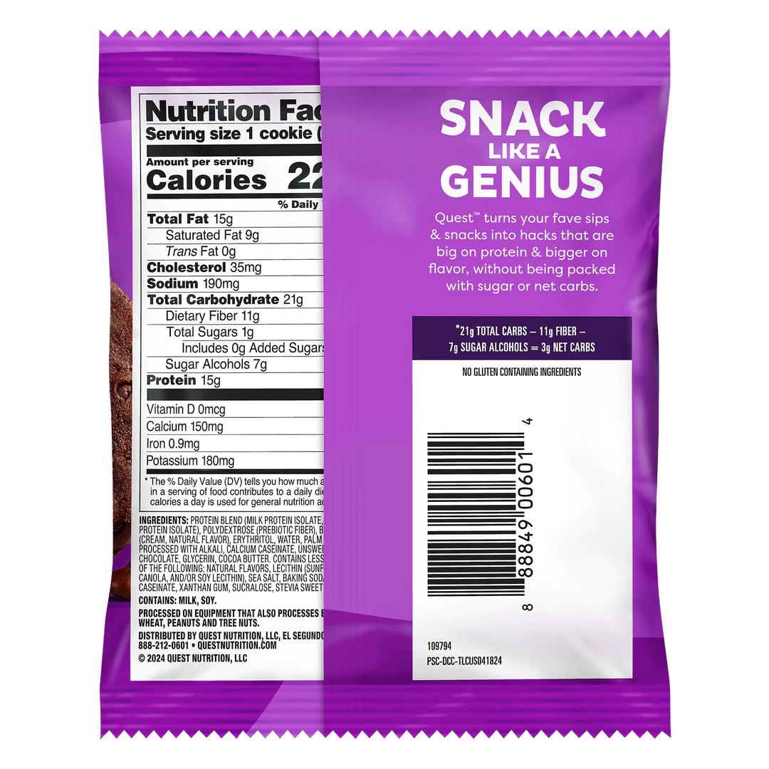 - HACK YOUR SNACK. Quest Chocolate Chip Protein Cookies are now softer & yummier† - with the satisfyingly sweet, chocolate chip taste that keeps you coming back. And with 1g of sugar and 2g of net carbs per serving they’re flipping the script on cookies.*